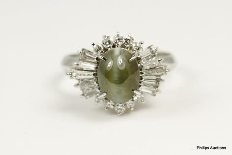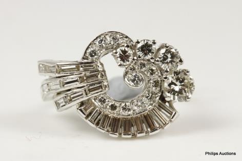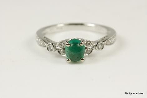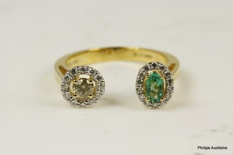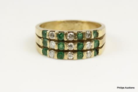 AN UNUSUAL DIAMOND RIBBON AND EMERALD SET DRESS RING
