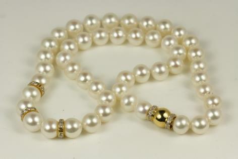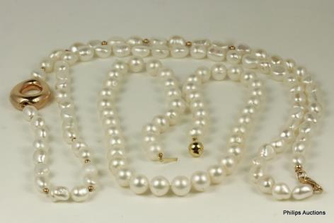 TWO PEARL NECKLACES, ONE DETAILED BY ROSE GOLD PLATED LINK