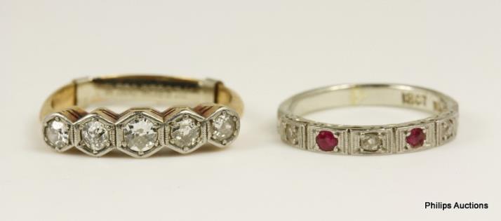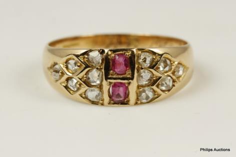 AN ANTIQUE 15CT ENGLISH OLD CUT DIAMOND & RUBY SET BAND RING