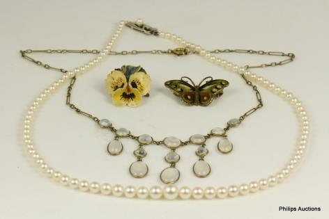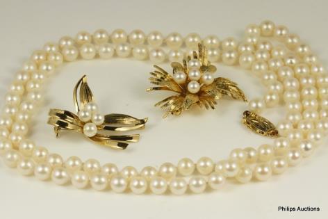 A STRAND OF CULTURED PEARLS AND TWO BROOCHES