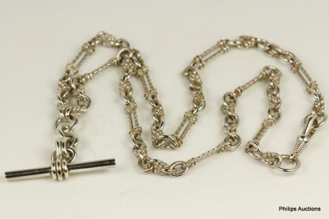 A SILVER FANCY LINK FOB CHAIN WITH T-BAR