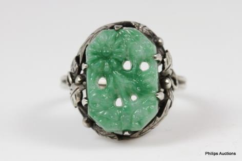 A VINTAGE CARVED GREEN GLASS SET DRESS RING