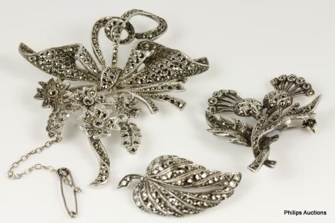 THREE VINTAGE SILVER MARCASITE SET BROOCHES
