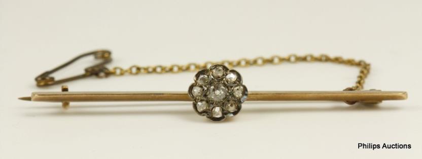 AN ANTIQUE OLD CUT DIAMOND FLORAL CLUSTER BAR BROOCH