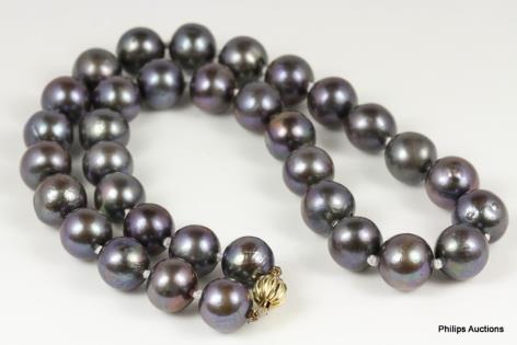 A LARGE STRAND OF GREY FRESH WATER PEARLS