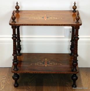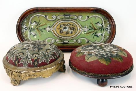 TWO VICTORIAN TAPESTRY FOOTSTOOLS AND A TRAY ON WHEELS