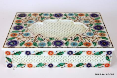 A LARGE INDIAN HARDSTONE AND SHELL INLAID BOX AND COVER