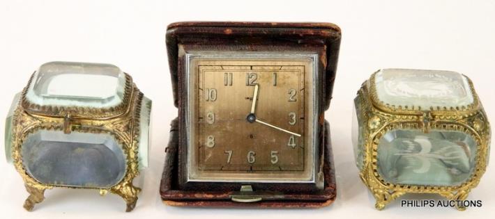 TWO GILT METAL MOUNTED GLASS BOXES AND A TRAVEL CLOCK