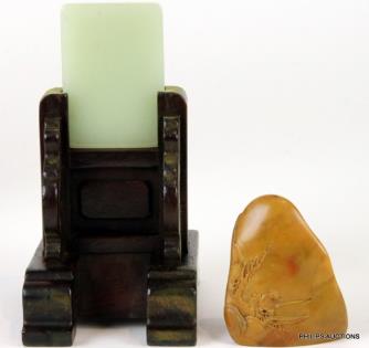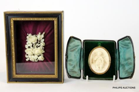 A MOUNTED IVORY FLOWER BROOCH AND A BOXED PLAQUE