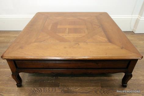 A LARGE HARDWOOD SQUARE COFFEE TABLE