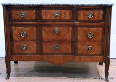 A TRANSITIONAL STYLE MARBLE TOPPED KINGWOOD COMMODE