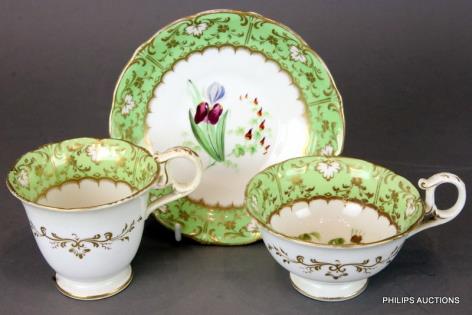 A FINE ROCKINGHAM FLORAL TRIO: TWO CUPS AND SAUCER