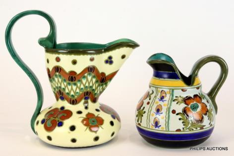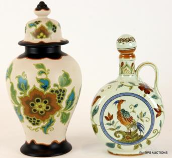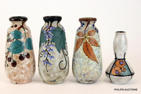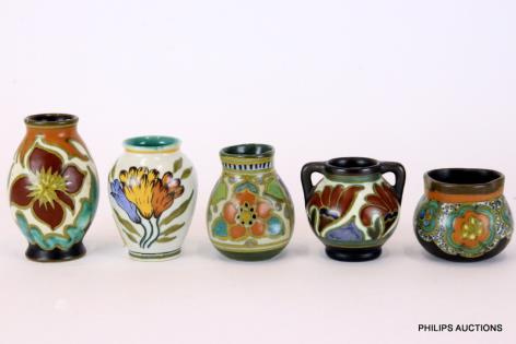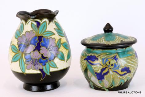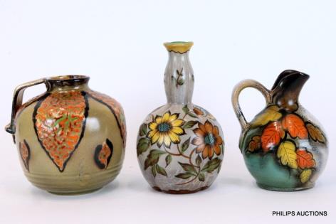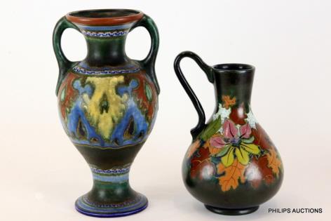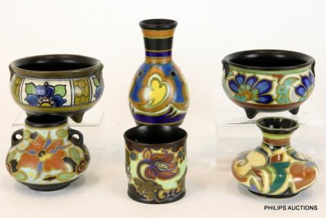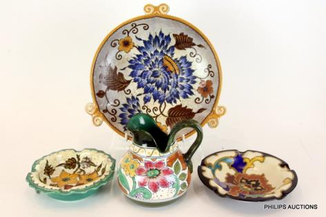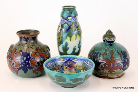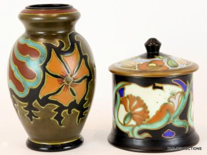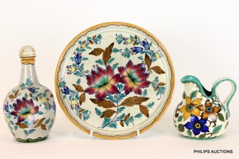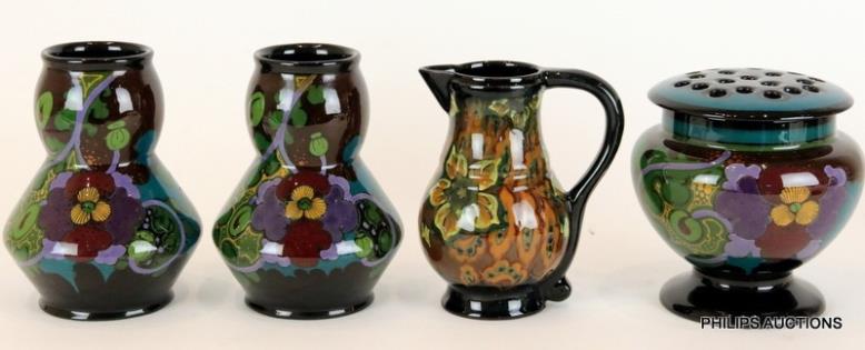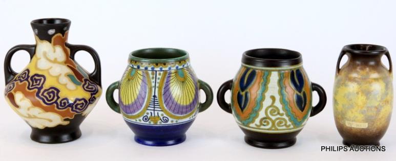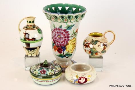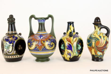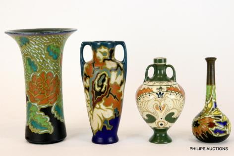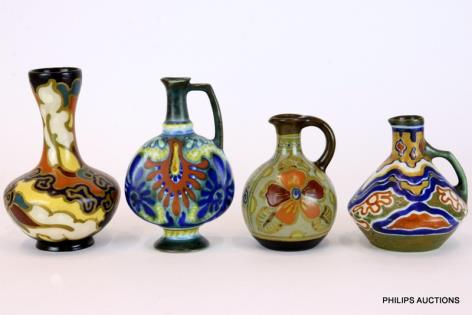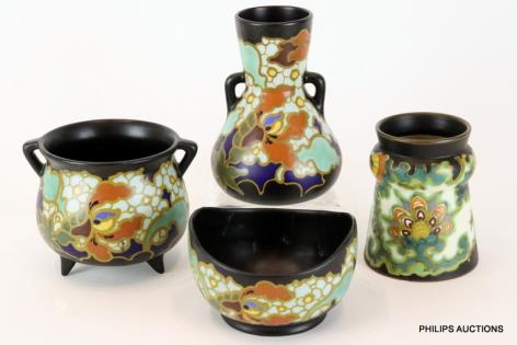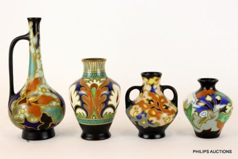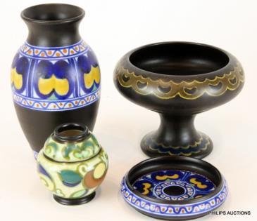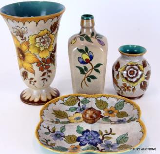 FOUR GOUDA POTTERY FLORAL ITEMS ON CREAM GROUND