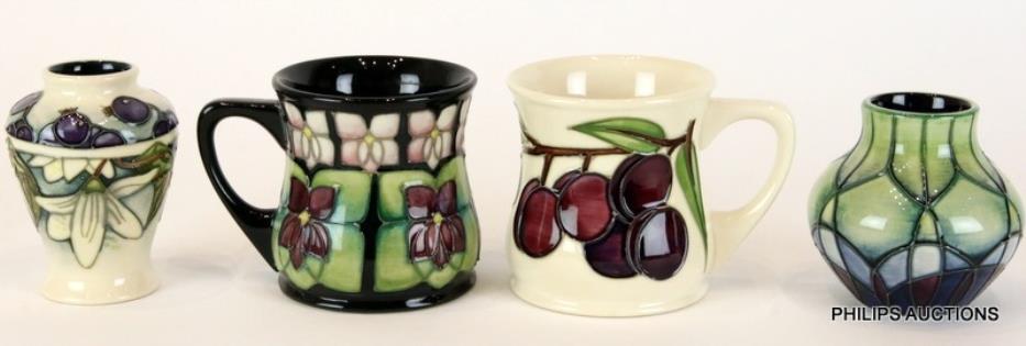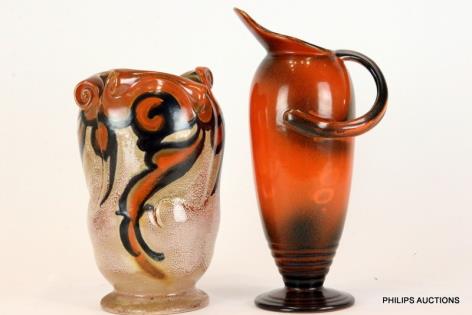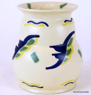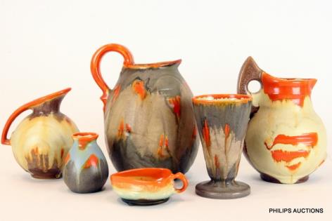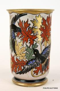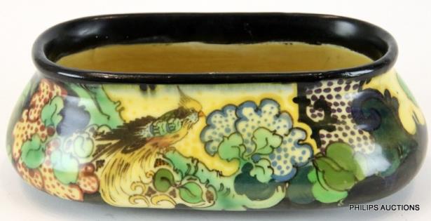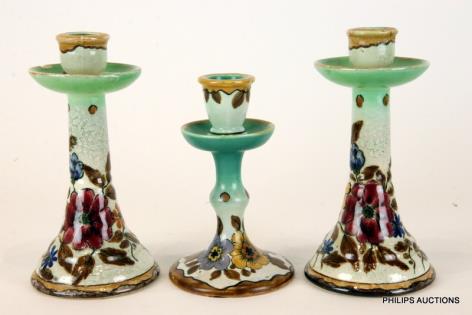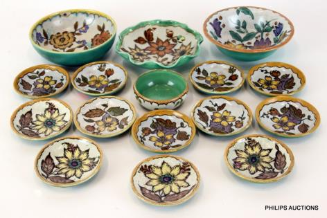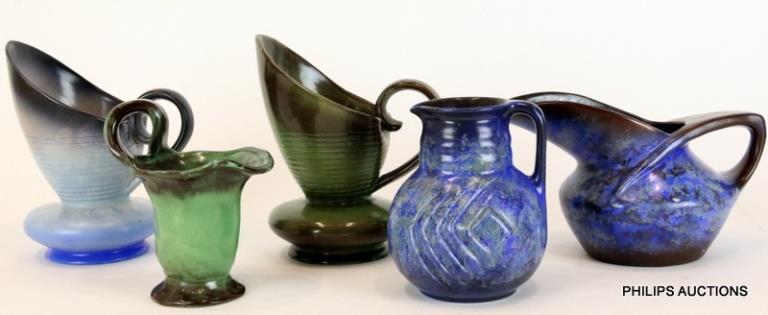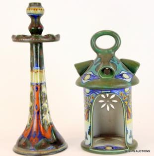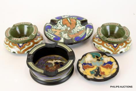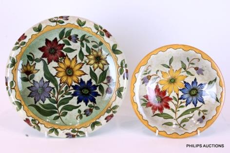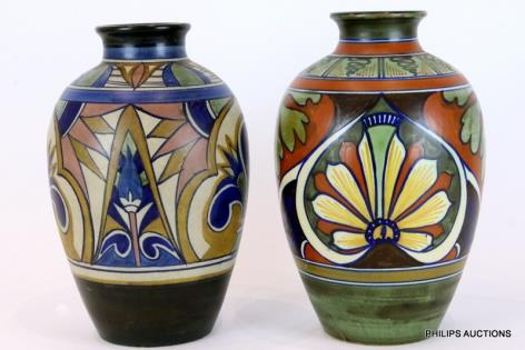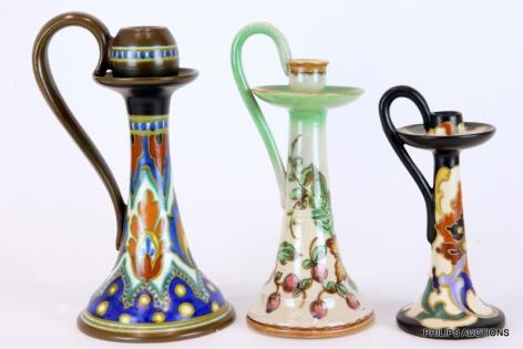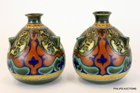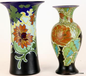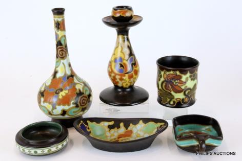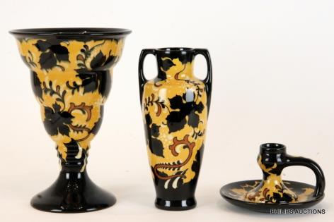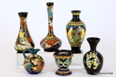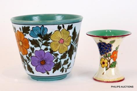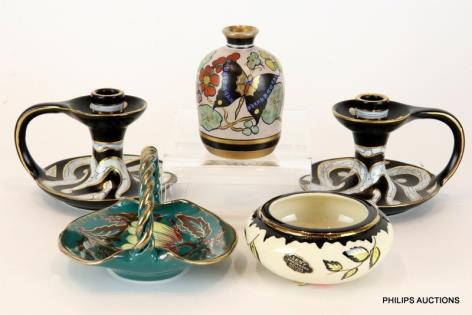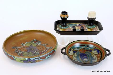 FOUR GOUDA POTTERY FLORAL ITEMS ON CREAM GROUND