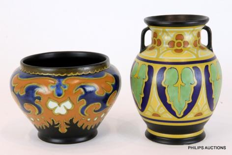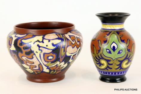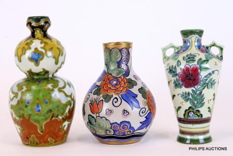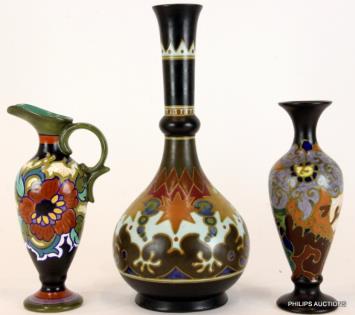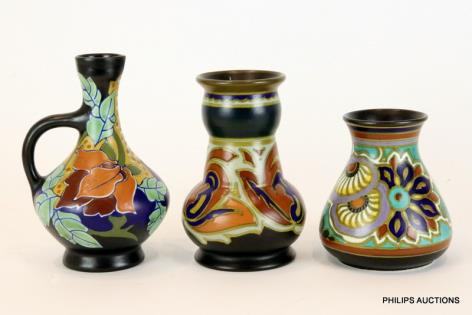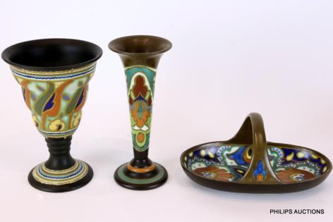 THREE GOUDA POTTERY MATT GLAZED VASES AND BASKET