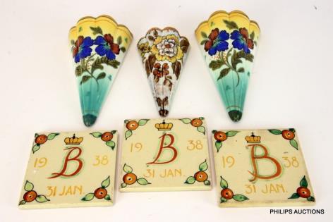 THREE GOUDA WALL POCKETS AND THREE TILES