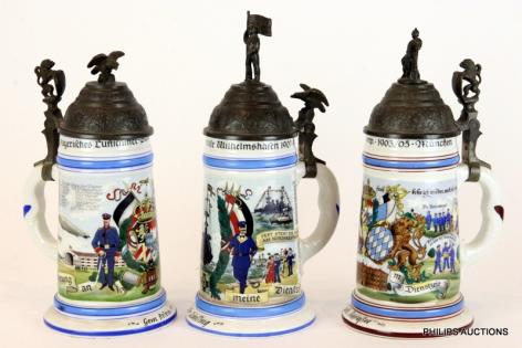 THREE GERMAN PORCELAIN REGIMENTAL BEER STEINS