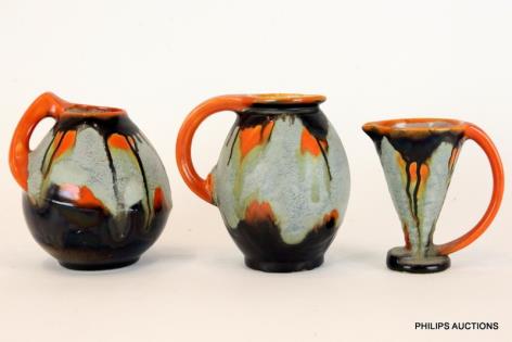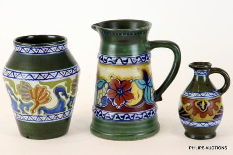 THREE GOUDA POTTERY GREEN GLAZED VASE AND JUGS