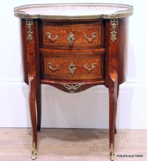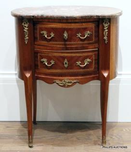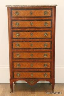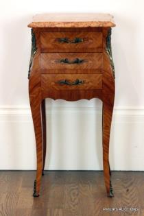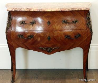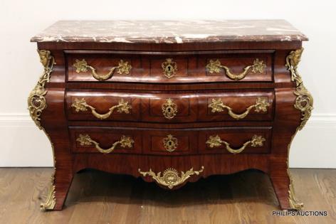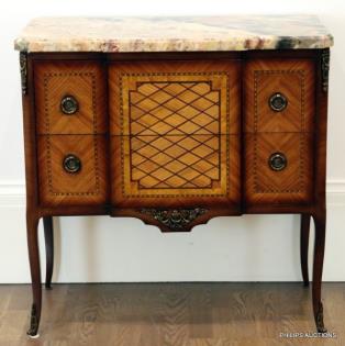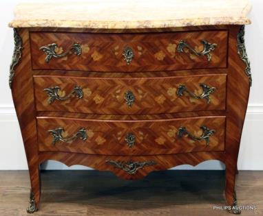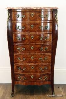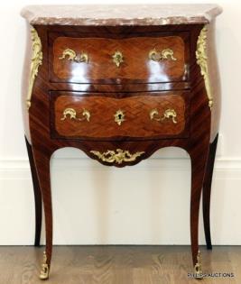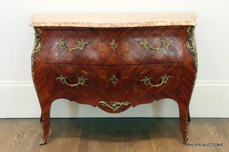 A LOUIS XV STYLE MARBLE TOP TULIPWOOD BOMBE COMMODE