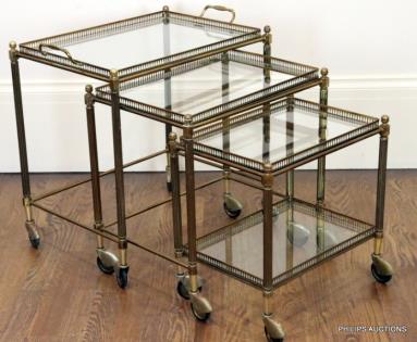 A NEST OF THREE BRASS AND GLASS TABLES ON WHEELS