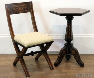 A VICTORIAN OCTAGONAL INLAID WALNUT TABLE AND MATCHING CHAIR