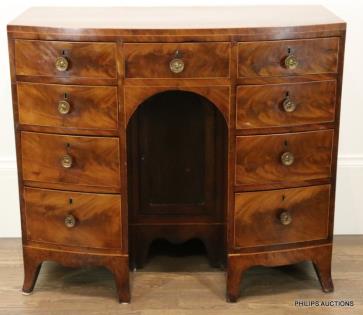A GEORGIAN STYLE FLAME MAHOGANY BOW-FRONT KNEEHOLE DESK