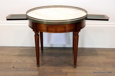 A LOUIS XVI STYLE CHERRYWOOD AND MARBLE SIDE TABLE