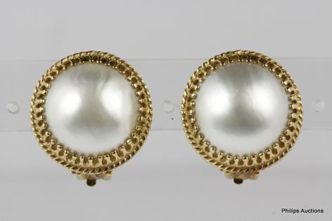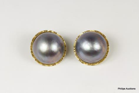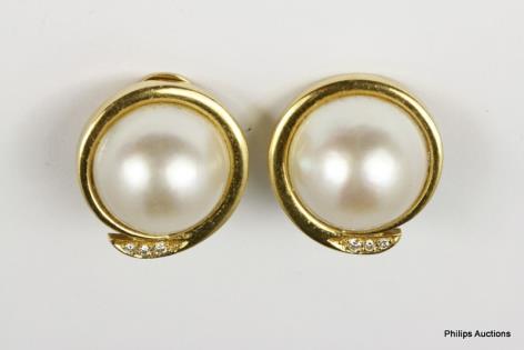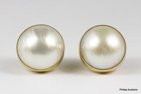 A PAIR OF MABE PEARL GOLD SET STUD EARRINGS