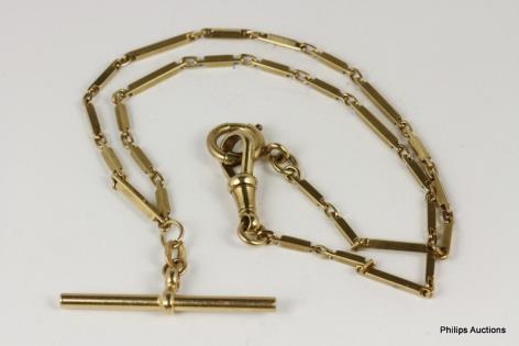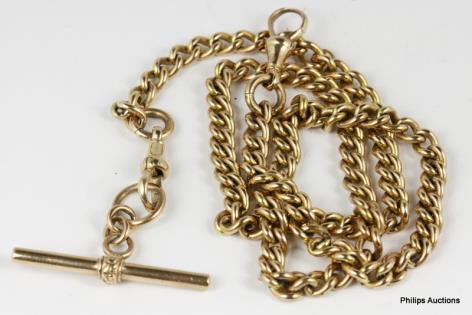 A SOLID 9CT ROSE GOLD CURB LINK FOB CHAIN WITH T-BAR 38 GRAMS