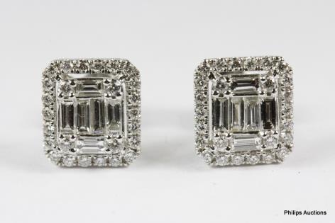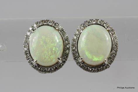 A PAIR OF SOLID WHITE OPAL AND DIAMOND CLUSTER STUDS
