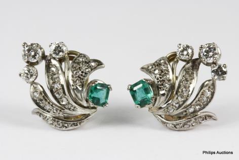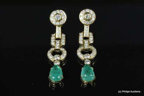 A STYLISH PAIR OF EMERALD AND DIAMOND DROP EARRINGS