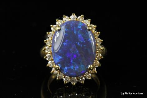 A LARGE SOLID BLACK OPAL AND DIAMOND CLUSTER RING