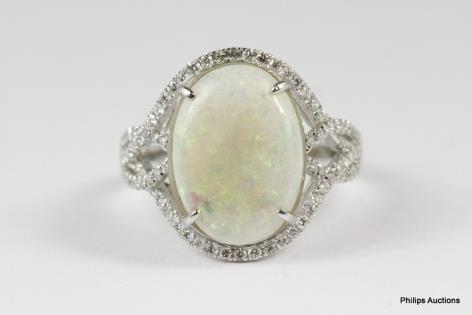 A SOLID WHITE OPAL AND DIAMOND CLUSTER DRESS RING