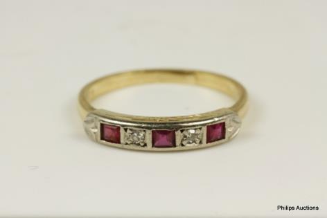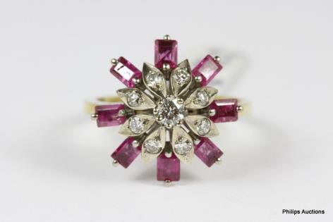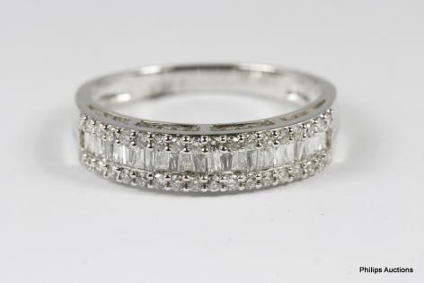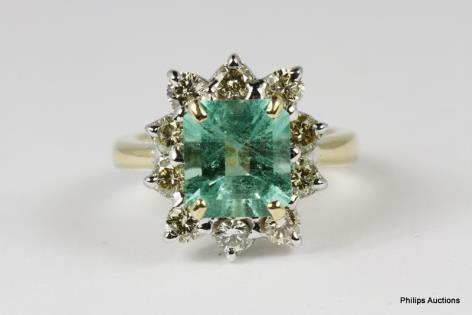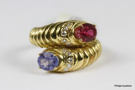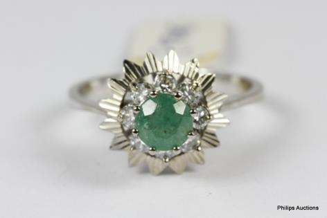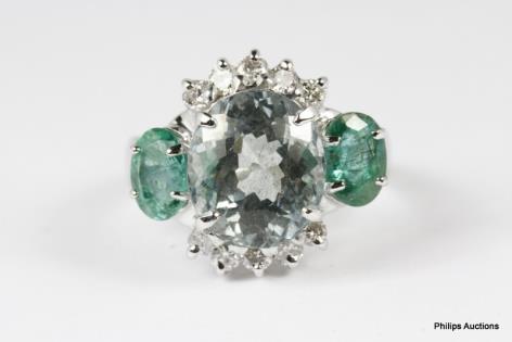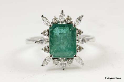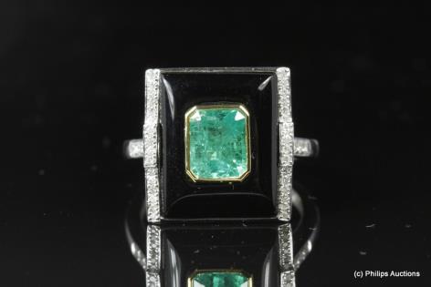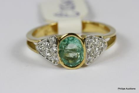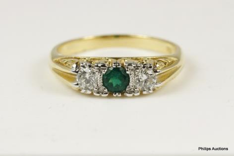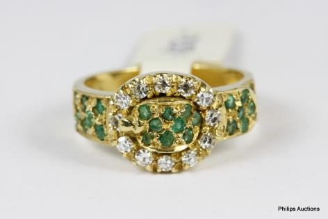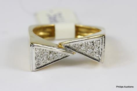 AN UNUSUAL DIAMOND RIBBON AND EMERALD SET DRESS RING