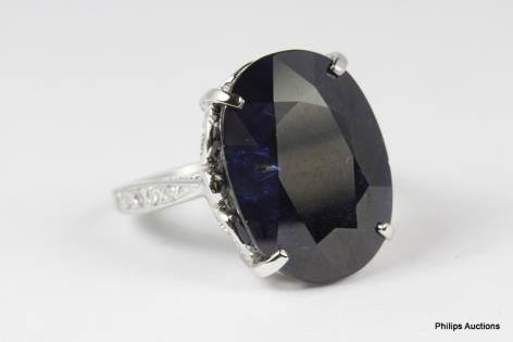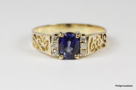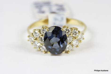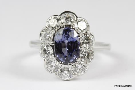 A ROUND VIOLET BLUE SAPPHIRE AND DIAMOND CLUSTER RING
