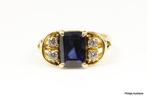 A VINTAGE 18CT GOLD CEYLONESE SAPPHIRE & DIAMOND DETAILED DRESS RING.
