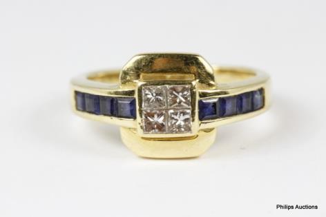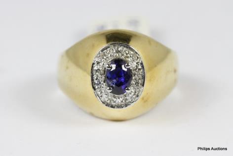 AN 18CT GOLD SAPPHIRE AND DIAMOND SET CLUSTER SIGNET RING, 7.4GRAMS