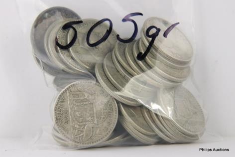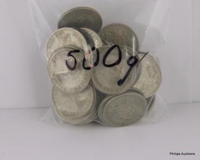 A MIXED OFFERING OF MOSTLY AUSTRALIAN 500 SILVER COINS & OTHER, 600 GRAMS.