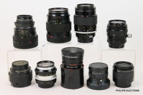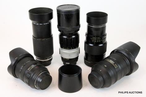 A GROUP OF FIVE LENSES AND ACCESSORIES