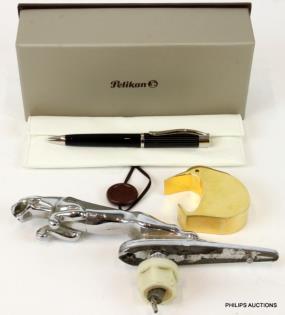 A PELIKAN PEN AND TWO METAL ORNAMENTS