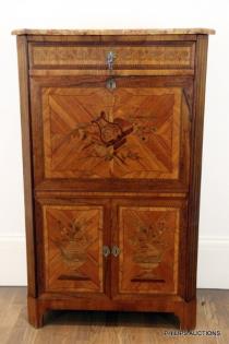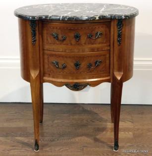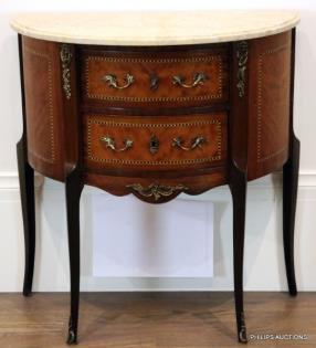 A TRANSITIONAL STYLE TULIPWOOD MARBLE TOPPED COMMODE