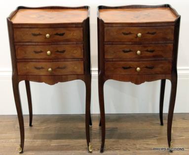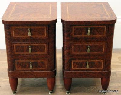 A PAIR OF TRANSITIONAL STYLE TULIPWOOD INLAID BEDSIDE TABLES