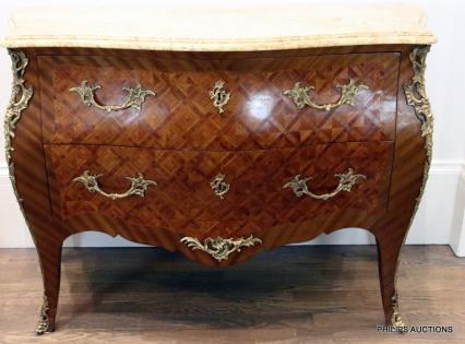 A LOUIS XV STYLE TULIPWOOD AND MARQUETRY BOMBE COMMODE