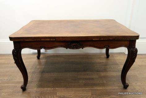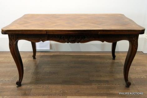 A REGENCE STYLE PARQUETRY WALNUT EXTENSION TABLE