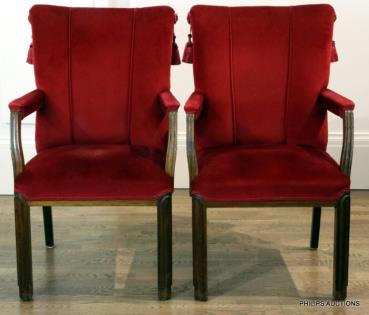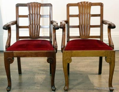 A PAIR OF UPHOLSTERED WALNUT ELBOW CHAIRS