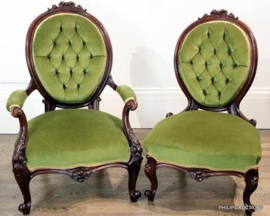 A PAIR OF MAHOGANY VICTORIAN LADY'S AND GENTLEMAN'S CHAIRS