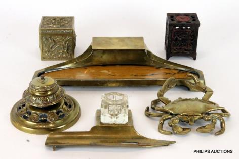 AN ASSORTED GROUP OF INKWELLS AND DESK SETS