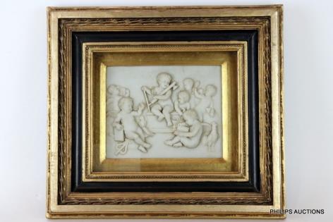 A GILT FRAMED COMPOSITE RELIEF PUTTI PLAQUE