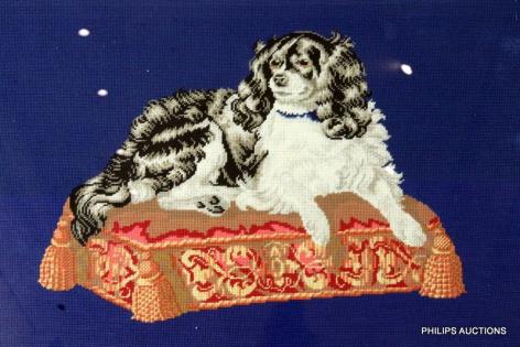 A VICTORIAN PETIT POINT TAPESTRY FRAMED PANEL OF A KING CHARLES SPANIEL