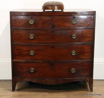 A GEORGIAN MAHOGANY BOW-FRONTED CHEST AND A FOOTSTOOL